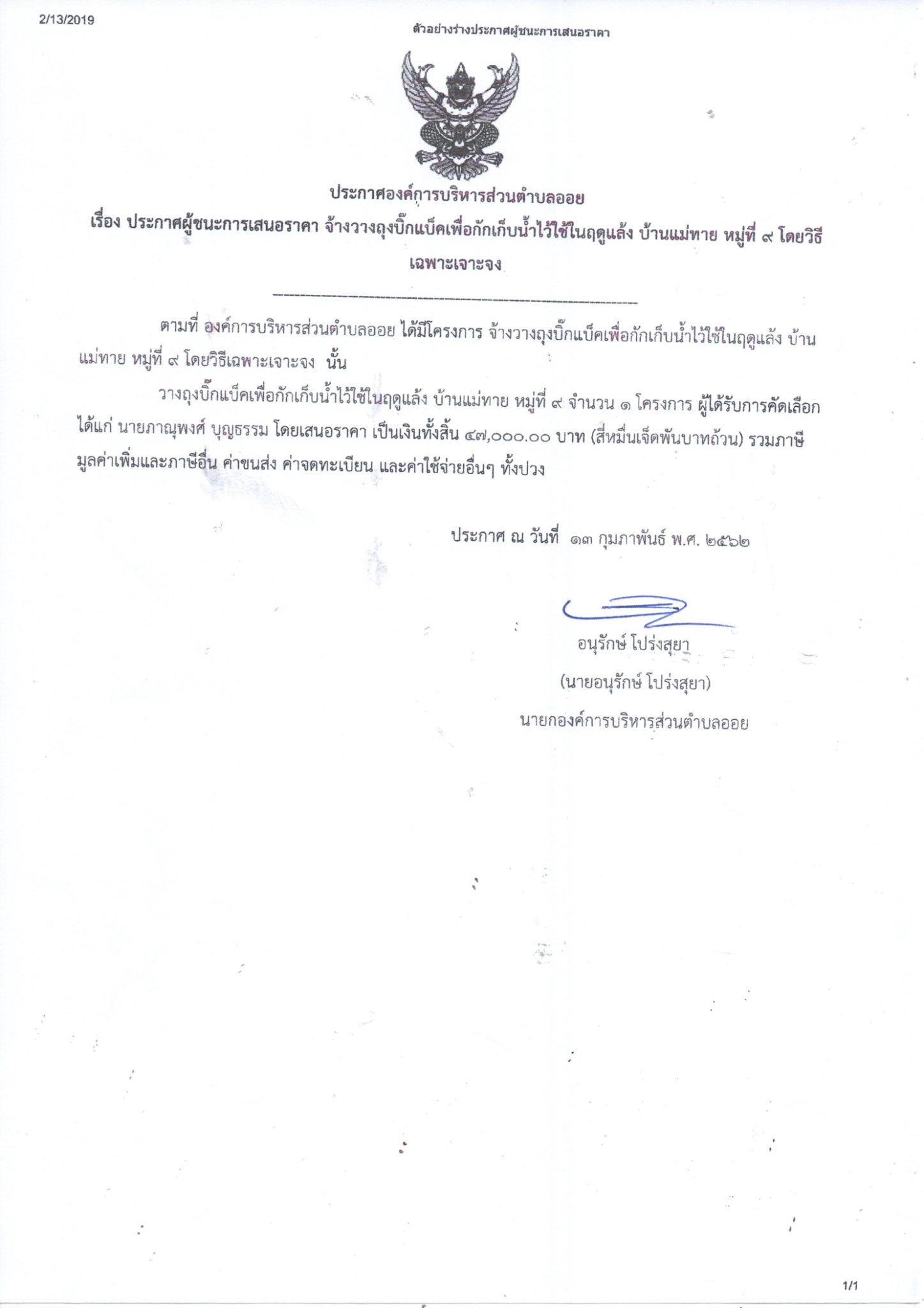 Download this file (ประกาศผู้ชนะการเสนอราคาจ้าง ขุดบ่อขยะ บ้านหล่าย หมู่ที่ 4.pdf)ประกาศผู้ชนะการเสนอราคาจ้าง ขุดบ่อขยะ บ้านหล่าย หมู่ที่ 4.pdf 44 kB